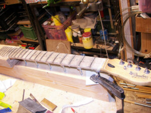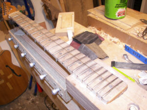 string tension on the guitar, the neck bows forward,release the tension, the neck bows back.if you level the frets while the neck is supported by the studs,in that same shape it was when under the tension of the strings, you get a much more accurate result of the leveling